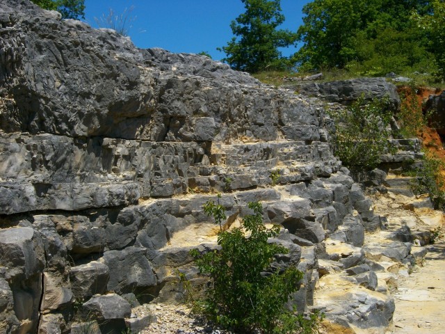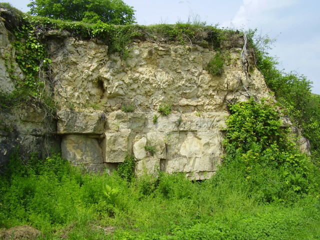 Dans le bassin de Brive, les dépôts du Jurassique (la période qui s’étend entre 200 et 150 milions d’années) sont des calcaires plus ou moins argileux (marnes) ; ce sont eux qui forment le causse de Martel ou les pentes marneuses (argile et calcaire) recouvertes de prés sous la butte de Turenne. Au cours de cette période, les faciès varient ; on distingue du bas vers le haut (= du plus ancien vers le plus récent) – des calcaires dolomitiques en petits bancs jaunes au début (Hettangien), qui se forment dans des lagunes sous de fortes influences marines ; ces roches constituent par exemple le sommet de la butte d’Yssandon ou la presque totalité de celle de Saint-Robert ; – des calcaires et des marnes puis encore des calcaires riches en débris coquilliers en particulier des huitres, constituent les dépôts des périodes appelées Domérien et Sinémurien ; comme elles sont plus résistantes que celles qui sont au dessus, ces roches forment toujours un petit ressaut dans la topographie, – ensuite viennent des marnes noires (étage toarcien) qui affleurent très mal même si elles sont épaisses (une centaine de mètres) ; leurs caractéristiques font penser des vasières : le milieu était réducteur (couleur noire), peu agité et la sédimentation très fine. On estime, mais on n’a pas de preuve absolue, que la totalité du Massif central était à cette époque recouvert par la mer. Après une grande régression marine vers – 175 Millions d’années, une plate-forme avec des coraux (et donc un climat toujours très chaud) s’installe sur la région au sens large ; au sud immédiat de Brive les dépôts sont représentés par – des calcaires très peu épais mais riches en débris de fossiles du début du Jurassique moyen (Aalénien) – les calcaires du Bajocien (calcaire à oolites, voir photo) dont les faciès montrent que la région était proche du rivage – puis les calcaires du Bathonien très fins, dits lithographiques, qui constituent l’essentiel des hautes falaises massives qui sont un élément important du paysage et le soubassement du Causse de Martel.