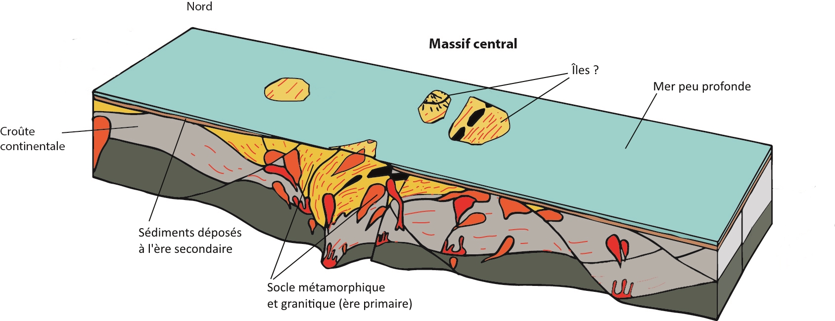 Ce diagramme (dessin C. Lansigut, Geologis) montre ce que pouvait être le Massif central dans la première partie de l’ère secondaire.