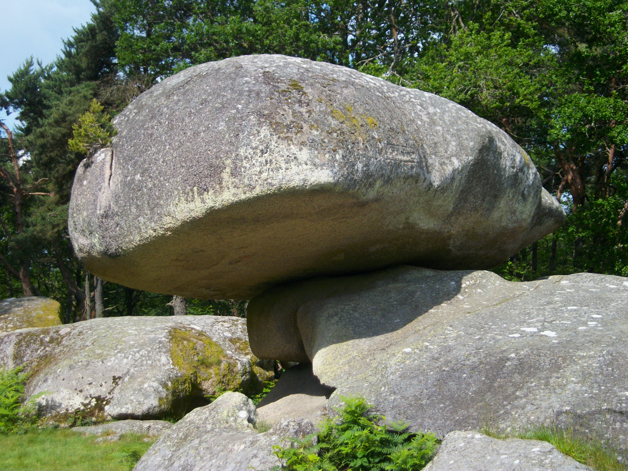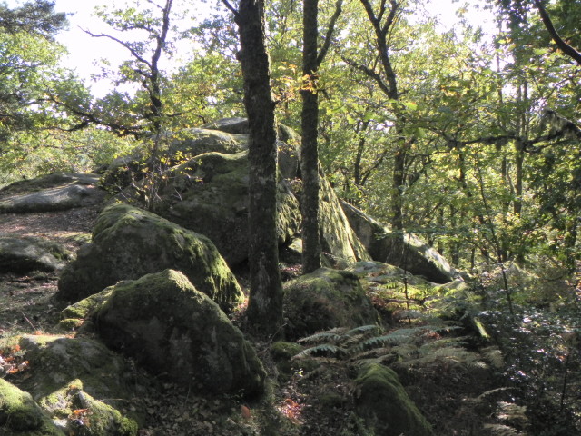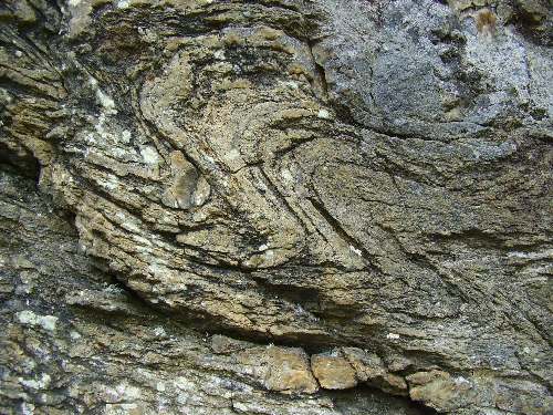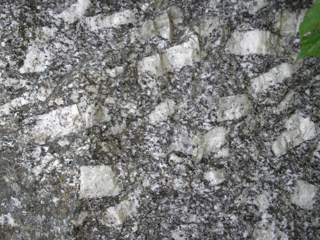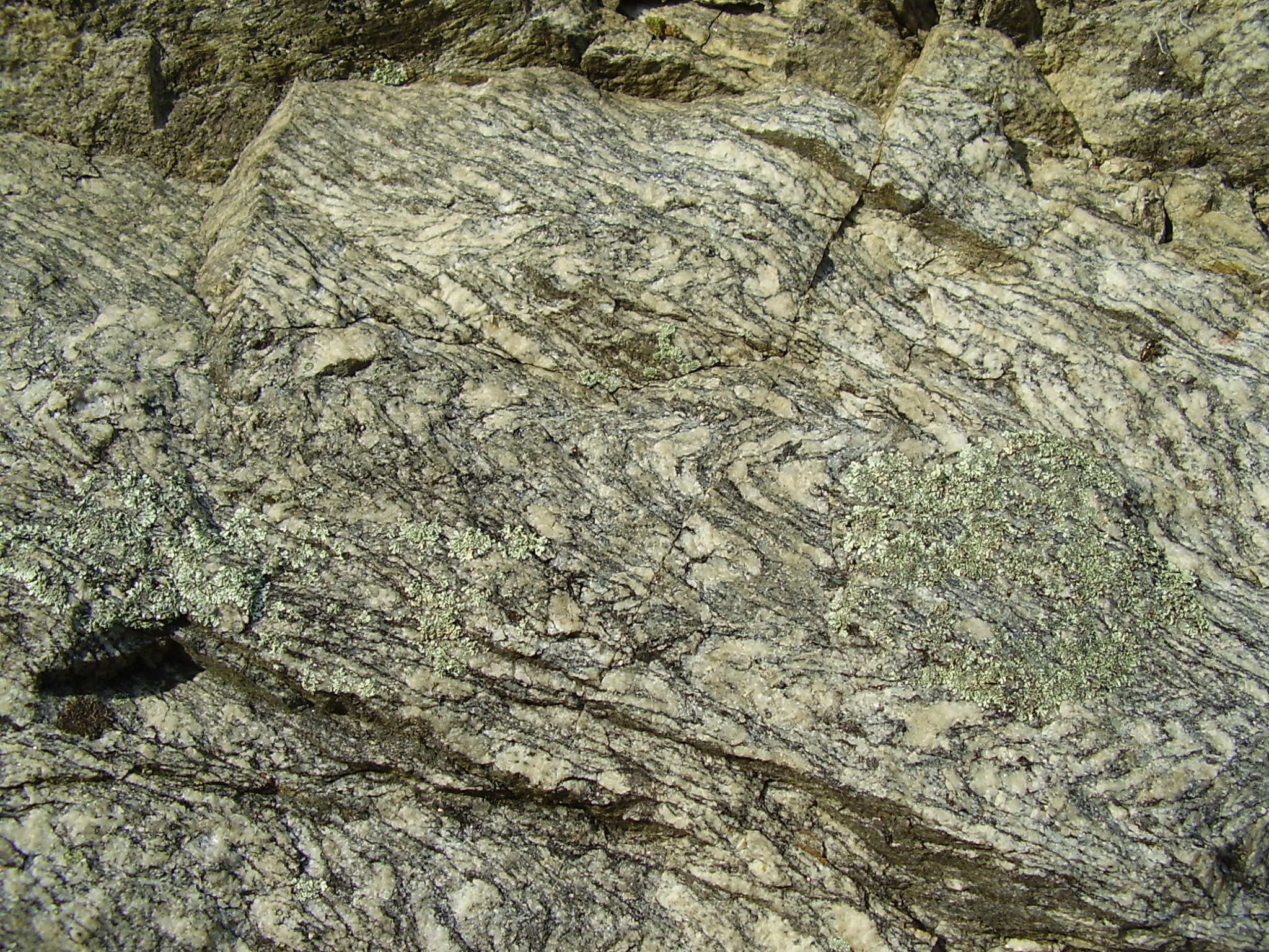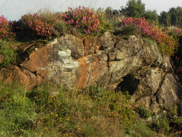Ces blocs de roches massives qui ne sont ni des granites (pas assez réguliers) ni des roches métamorphiques (peu d’orientation dans les minéraux qu’elles contiennent) sont des migmatites (ou anatexites), autrement dit, des gneiss qui ont commencé à fondre puis qui ont recristallisé sur place.