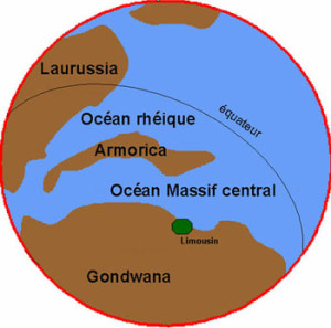 Au verso du panneau à l’entrée du musée, une planisphère (figure ci-dessus) nous montre l’état de l’hémisphère sud il y a 400 millions d’années. (Le Limousin était à l’époque dans l’hémisphère sud en bordure de l’océan « Massif central »).