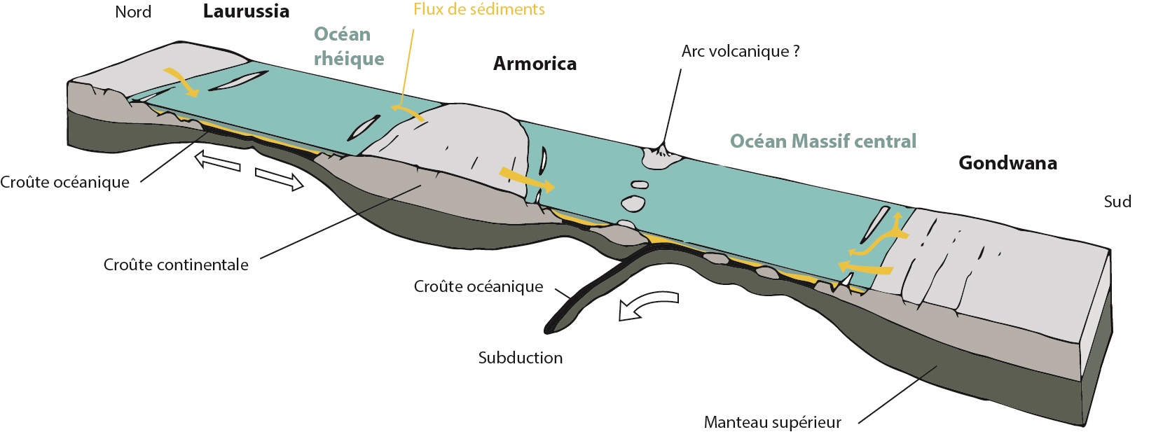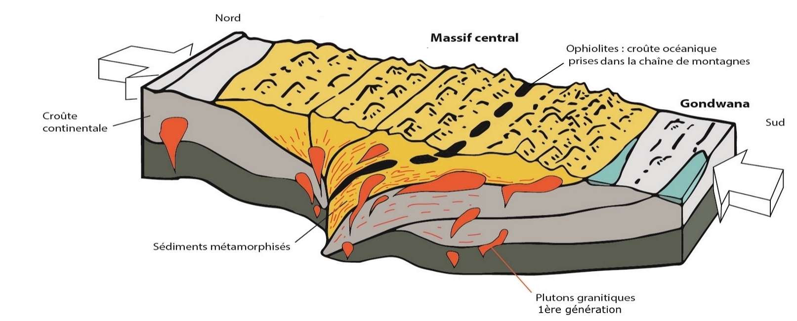 Au total, les sédiments de départ (des grès, des argiles) sont devenus peu à peu des gneiss et des schistes, les basaltes qui tapissaient le fonds de l’océan Massif central ont été transformés en amphibolites et les roches du manteau supérieur, en serpentines (schémas 1 et 2).