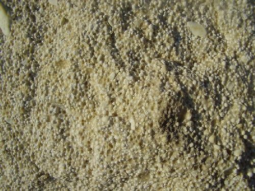 Deux roches sédimentaires bien diférentes : à gauche le détail d’un calcaire oolitique (origine chimique) près de Turenne; à droite un grès grossier (conglomérat) près de Brive. Cl HB
