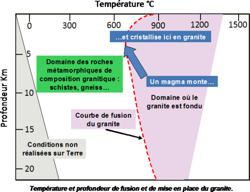 Les roches plutoniques proviennent de la cristallisation lente de magmas. Les roches plutoniques constituent une partie importante de la croûte terrestre : granites dans la croûte continentale, gabbros dans la croûte océanique. Comme les roches volcaniques, les roches plutoniques se forment par refroidissement de magmas. Cependant ce refroidissement est lent (plusieurs milliers d’années) car il a lieu en profondeur (par exemple 5 – 15 km) et donc dans un environnement chaud : à 10 km de profondeur, la température est de 300°.Si l’on préfère, il y a des magmas mais pas de volcanisme : tout se passe discrètement à plusieurs kilomètres de profondeur.