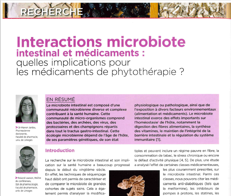 Un article co-écrit par Manon Jardou (ancienne étudiante en thèse) et Roland Lawson (Maître de Conférence, responsable de la thématique « Microbiome et transplantation« ) a été publié dans le numéro 146 de mai/juin 2025 de la revue Phytothérapie Européenne. Il est intitulé « Interaction microbiote intestinal et médicaments : quelles implications pour les médicaments de phytothérapie ? »