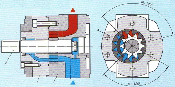 Ce type de construction comprend également une compensation axiale mais aussi une compensation radiale sous la forme d'un élément en forme de croissant intercalé entre la le pignon et la couronne dentée. On trouve couramment des pompes de cylindrées de 3 cm3 à 250 cm3 pour des pressions maximales de refoulement pouvant atteindre 300 bars.