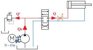 Lorsque la tige de vérin se déplace, l'intégralité du débit fourni par la pompe aliment la chambre arrière du vérin. La vitesse de sortie de la tige dépend de ce débit : V = Q/S.