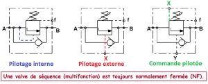 La fonction d'une valve de séquence est d'ouvrir un circuit seulement si la pression atteint ou dépasse une valeur prédéfinie en un endroit test. Cela permet d 'obtenir des mouvements séquentiels sans adjonction d'organes de commande.