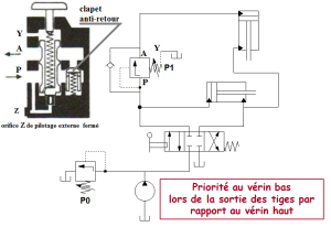 On permet la manœuvre du vérin haut seulement si le vérin bas a son piston sorti et si la pression dans sa grande chambre atteint une valeur suffisante égale à P1, valeur d'ouverture de la valve de séquence.