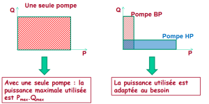 En utilisant une pompe Base Pression (BP) à forte cylindrée et une pompe Haute Pression (HP) à faible cylindrée, on peut adapter la puissance produite au besoin dans les 2 phases de travail.