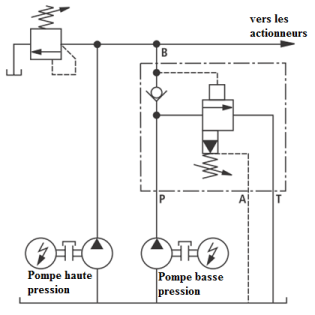 On peut donc dériver à pression nulle le débit de la pompe BP lorsque la pression de refoulement atteint le seuil réglé sur la valve de conjonction-disjonction :