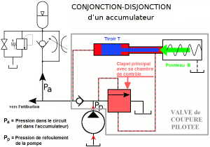 CONJONCTION : mise en charge de la pompe pour charger l'accumulateur lorsque la pression de refoulement ( et donc la pression dans l'accumulateur) atteint un minimum Pmin = P1. Le débit de la pompe est alors dirigé dans le circuit de l'accumulateur jusqu'à ce qu'il soit plein et que la pression nécessaire soit atteinte.
