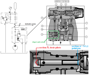 La chambre de contrôle étant de nouveau isolée du réservoir, la pression dans celle-ci augmente. Le clapet se referme et provoque la CONJONCTION. La pompe débite alors de nouveau dans le circuit et peut de nouveau remplir l'accumulateur. La pression dans l'accumulateur va donc varier entre 2 pressions minimale et maximale qui dépendent du rapport S/s utilisé dans la construction de la valve :