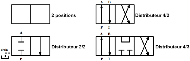 Les différentes solutions de raccordements des orifices du distributeur sont représentées dans des rectangles qu'on appelle des positions. Il y a couramment 2 ou 3 positions.