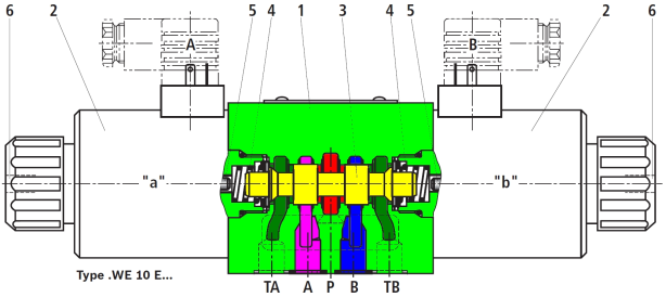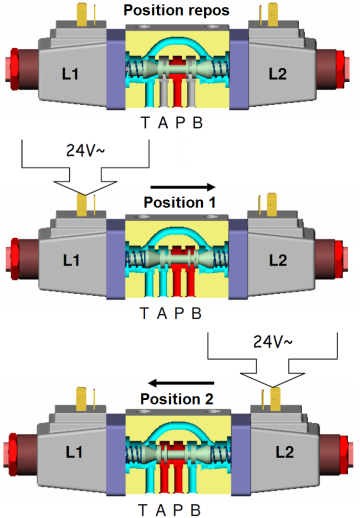 En position de repos (stable), les bobines ne sont pas alimentées et les ressorts sont en équilibre statique. Le tiroir est en position centrale et tous les domaines sont isolés les uns des autres : les orifices P, T, A et B sont fermés. C'est donc un distributeur à centre fermé.