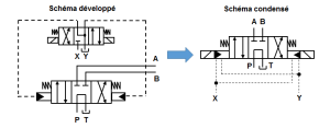 Sur les schémas de systèmes hydrauliques, ces distributeurs à 2 étages peuvent être représentés sous forme :