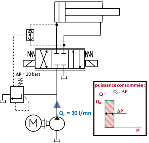 On a donc bien ici un système qui s'adapte au besoin en pression. On peut remarquer que cette adaptation en pression est simplement obtenue avec un distributeur compensé en pression (intégration de la balance de pression).