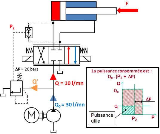 pour vaincre la charge F = 10 000 N, la pression P2 augmente jusqu'à atteindre la valeur : P2 = F/S = 50 bars.