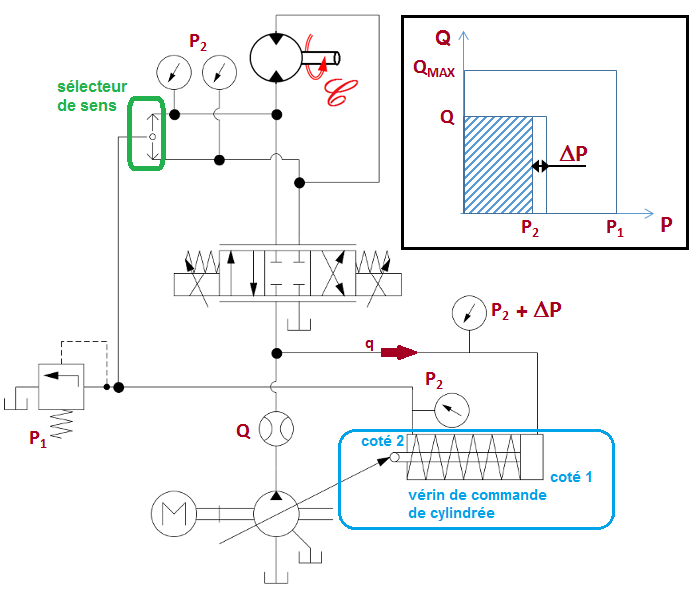 Le schéma ci-contre présente un des principes les plus simples permettant une adaptation de la charge. Il consiste à utiliser une balance de pression à 3 voies et à exploiter le débit excédentaire de la pompe pour commander la réduction de sa cylindrée. Le vérin de commande de cylindrée est équipé d'un ressort avec un tarage correspondant au ΔP à maintenir constant sur le distributeur pour assurer la régulation du débit.