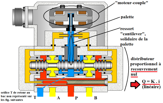 La position de la palette située entre les 2 buses est commandée par un moteur-couple. Cette palette est prolongée d'un élément élastique appelé ressort cantilever. L'extrémité de ce ressort est logé dans une rainure du tiroir.
