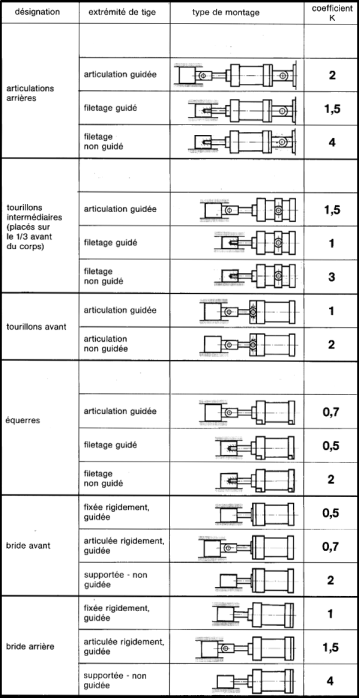 de sa longueur libre de flambage L = course . K. Le facteur K dépend du mode de fixation du vérin et du type de guidage de l'extrémité de la charge. Ces coefficients sont en général donnés sous forme de tableau[1] par les constructeurs de vérins.