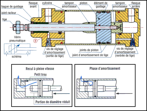 Pour ralentir la vitesse de la tige en fin de course, on équipe la tige de tampons amortisseurs qui pénètrent dans les alésages des extrémités. L'évacuation du volume de fluide de la chambre principale est alors ralentie par des limiteurs de débit réglables.