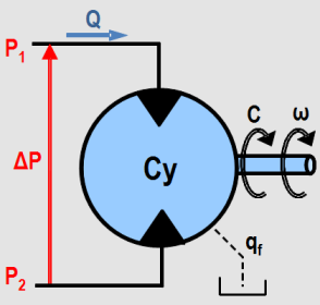 Le fluide étant considéré comme incompressible, le débit volumétrique s'exprime en fonction de la cylindrée Cy et de la fréquence de rotation N (tour/s). La cylindrée d'un moteur (ou d'une pompe) correspond au volume déplacé en 1 tour. On en déduit : Q = Cy. N