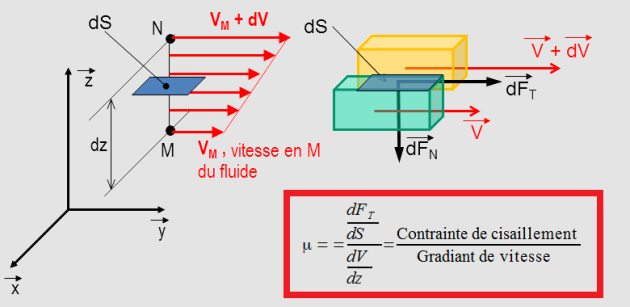 La viscosité absolue μ (Mu) se définit à partir de de la contrainte de cisaillement qu'elle crée au sein du fluide. C'est le rapport entre la contrainte de cisaillement qui s'applique à une couche fluide et le gradient de vitesse qui existe dans ce fluide :