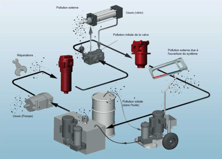 Les circuits hydrauliques modernes fonctionnent généralement à des pressions élevées. Il faut donc s'assurer que les fluides hydrauliques conservent leurs qualités à ces pressions et soient débarrassées de pollutions qui peuvent être de nature différentes :