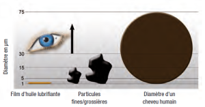 La limite de discrimination de l'œil humain moyen normal est de l'ordre de 40 µm. Les analyses de particules sont effectuées à l'aide d'un microscope ou dans le système fluide avec des compteurs de particules qui fonctionnent selon le principe de l'occultation de la lumière. La taille des particules solides polluantes sont général de l'ordre de 5 à 15 fois l'épaisseur d'un film de lubrification (d'un palier par exemple).