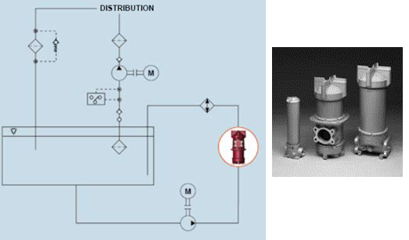 Grâce à la filtration en continu, indépendamment du cycle de travail de la machine, on atteint avec des éléments filtrants plus fins des propretés d'huile exceptionnelles. Cela implique un investissement et une consommation énergétique un peu plus importants pour la centrale hydraulique (pompe du circuit de filtration à entraîner) mais les éléments filtrants qui sont utilisées à faible pression, sont peu coûteux.