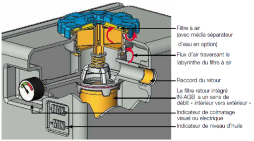 Le reniflard a pour rôle de maintenir une pression à l'intérieur du réservoir proche de la pression atmosphérique (ou légèrement supérieure) en permettant les entrées et sortie d'air nécessaires sans introduire de pollution. On retrouve donc sur cet équipement le filtre à air qui retient les particules et un filtre dessiccant qui assèche l'air :