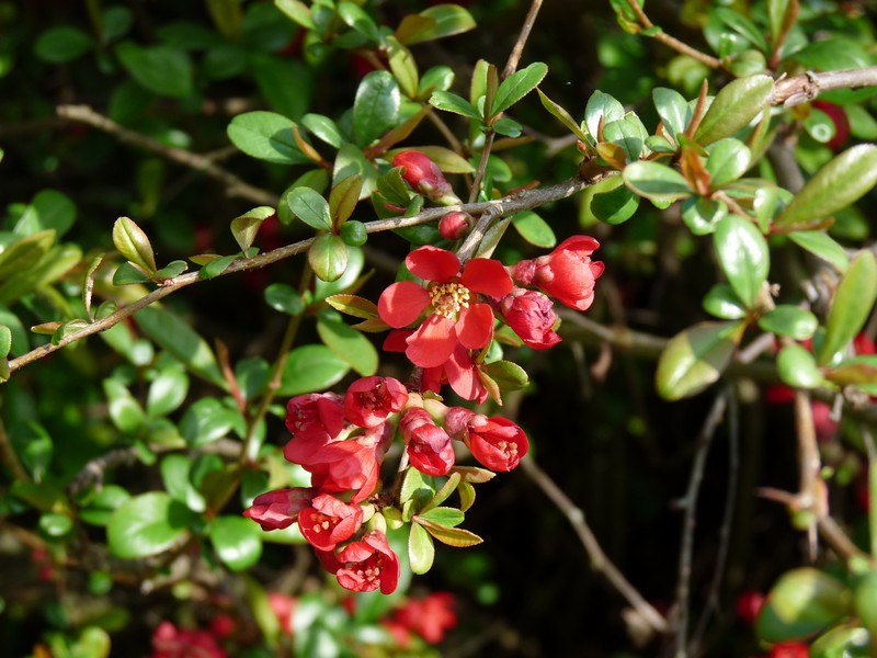 Le cognassier du Japon a été introduit en Europe dès le 17ème siècle et c’est maintenant un arbuste d’ornement très commun. Sa floraison rouge est plutôt abondante dès début février. Le reste du temps, on peut le reconnaître grâce aux oreillettes présentes sur ses rameaux. Mais attention à ses épines, même si elles sont moins présentes que chez d’autres cognassiers. |