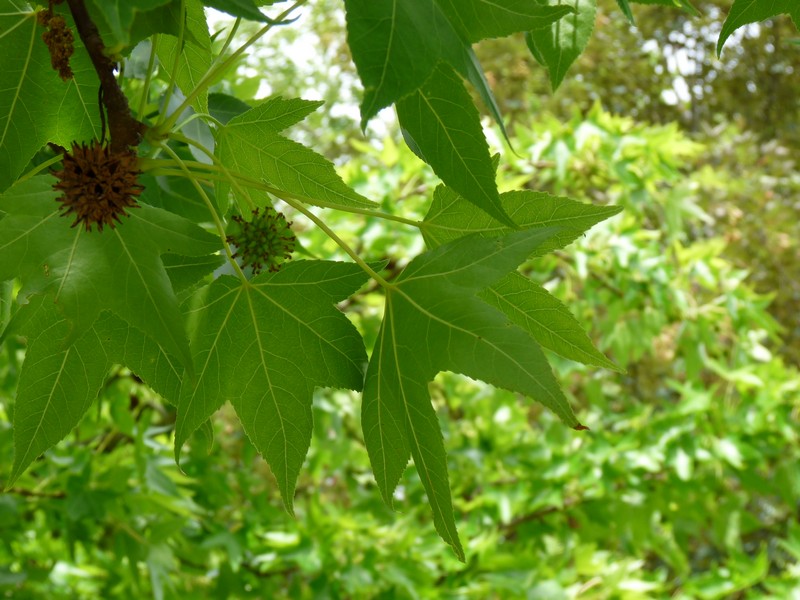 Liquidambar styraciflua Son nom signifie ambre liquide à cause de sa sève bronzée qui coule facilement en cas d’incision. Elle était d’ailleurs utilisée sous le nom de styrax en parfumerie et en médecine. On fabriquait même des chewing-gums à partir de sa sève. Le liquidambar se caractérise par un port conique qui s’atténue avec l’âge et par la teinte rouge-orangée que son feuillage prend en automne. Son bois, dur et de couleur rouge,  intéresse beaucoup l’industrie du meuble.