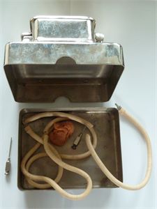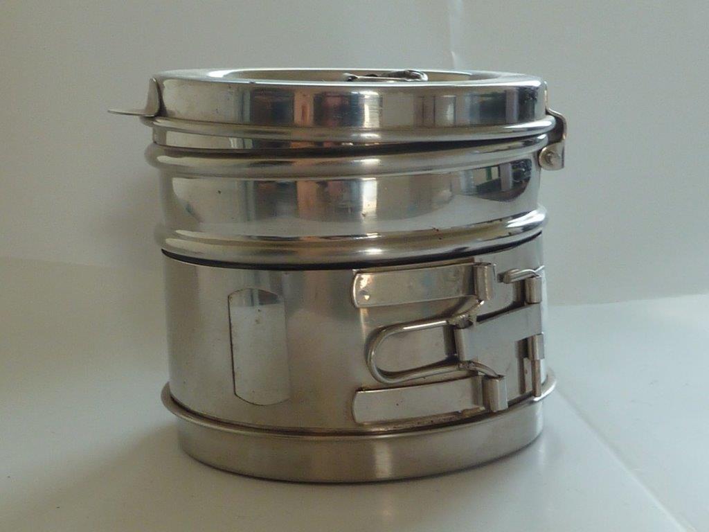 Récipient pour stériliser les instruments ou les pansements dans l’étuve à chaleur sèche à 160°C Inventeur : Dr Poupinel (1885)