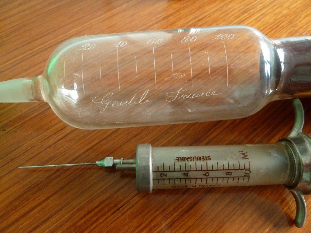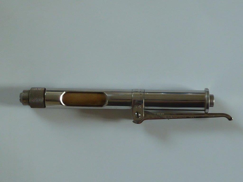 Injecteur sans aiguille de tous types de liquides (anesthésiants, corticoïdes, vaccins…) par projection intradermique, sans aiguille, sans douleur et sans contact avec la peau du patient Inventeur : Dr Krantz (1959)