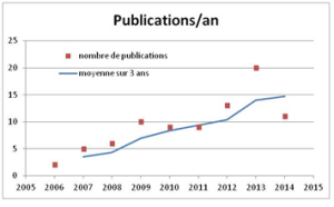 Evolution du nombre de publications par an depuis 2006 et moyenne glissant sur 3 ans (équipe GCD d’Egletons seulement)