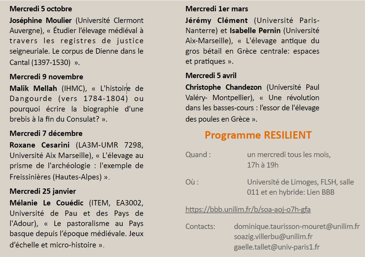 Les laboratoires Geolab et Criham (CNRS & Université de Limoges) organisent des séminaires dans le cadre du programme RESILIENT, un mercredi par mois, de 17h à 19h à l’Université de Limoges en salle 001 ou à distance en cliquant sur ce lien.