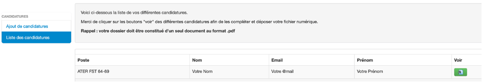 Ensuite vous devez cliquer sur « Liste des candidatures » afin de télécharger votre dossier de candidature :
