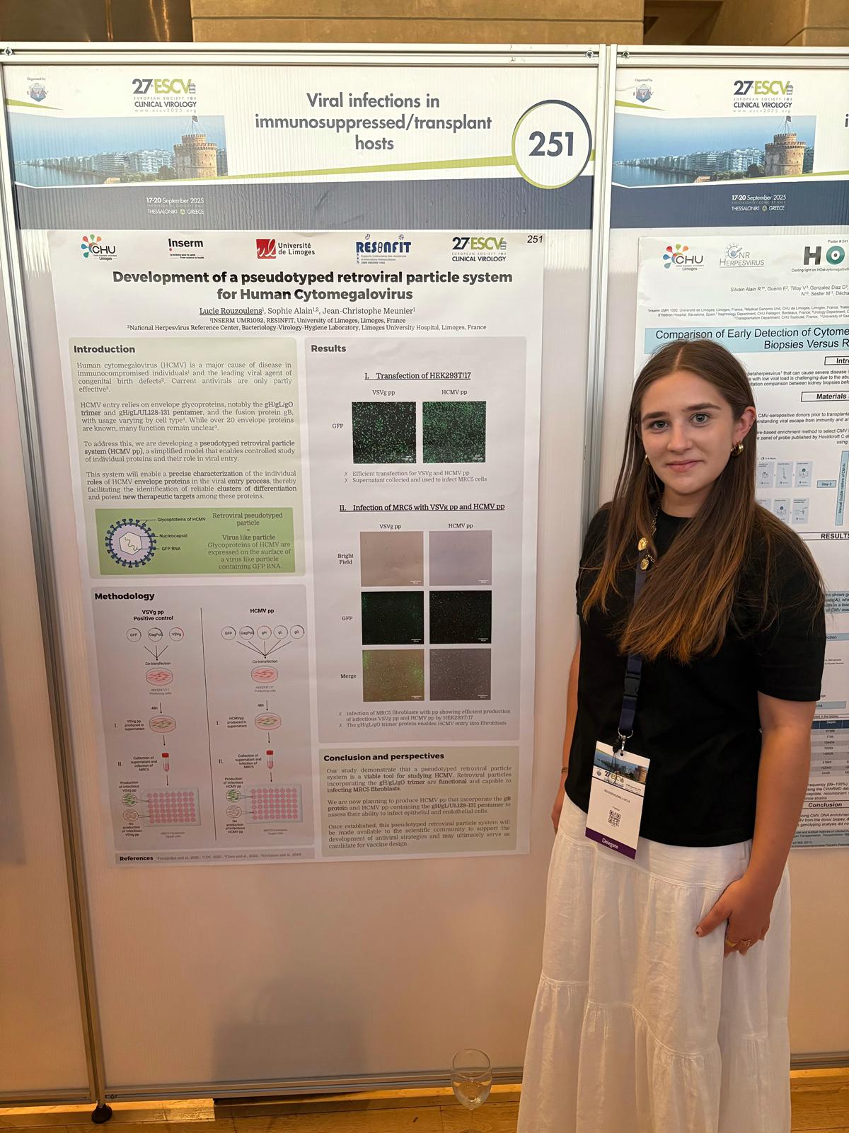 La réunion annuelle de l’ESCV a toujours été un événement majeur pour la communauté scientifique spécialisée en virologie clinique. A cette occasion, Sophie Alain, Jean-Christophe Meunier, Sarah Mafi, Nader Bayda, Alain Renoir Silvain et Lucie Rouzoulens ont fait le déplacement. Les quatre derniers cités y présentaient notamment leur travail à travers de poster, tandis que Sophie Alain, co-directrice de notre UMR 1092 RESINFIT, a effectué une présentation sur le thème « Comprehensive Herpesviruses Antiviral Resistance Mutation Database CHARMD and HSA tool for easy cytomegalovirus genotyping interpretation ».
