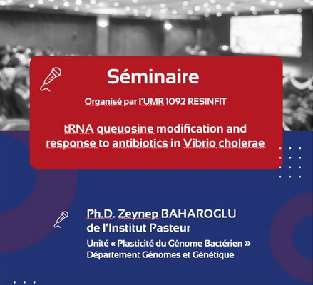 L'UMR 1092 est heureux de vous convier au séminaire "tRNA queuosine modification and response to antibiotics in Vibrio cholerae" présenté par le Dr Zeynep Baharoglu. Il aura lieu le mardi 6 décembre à 10h30 en salle R26 du CBRS. Affiche séminaire 6