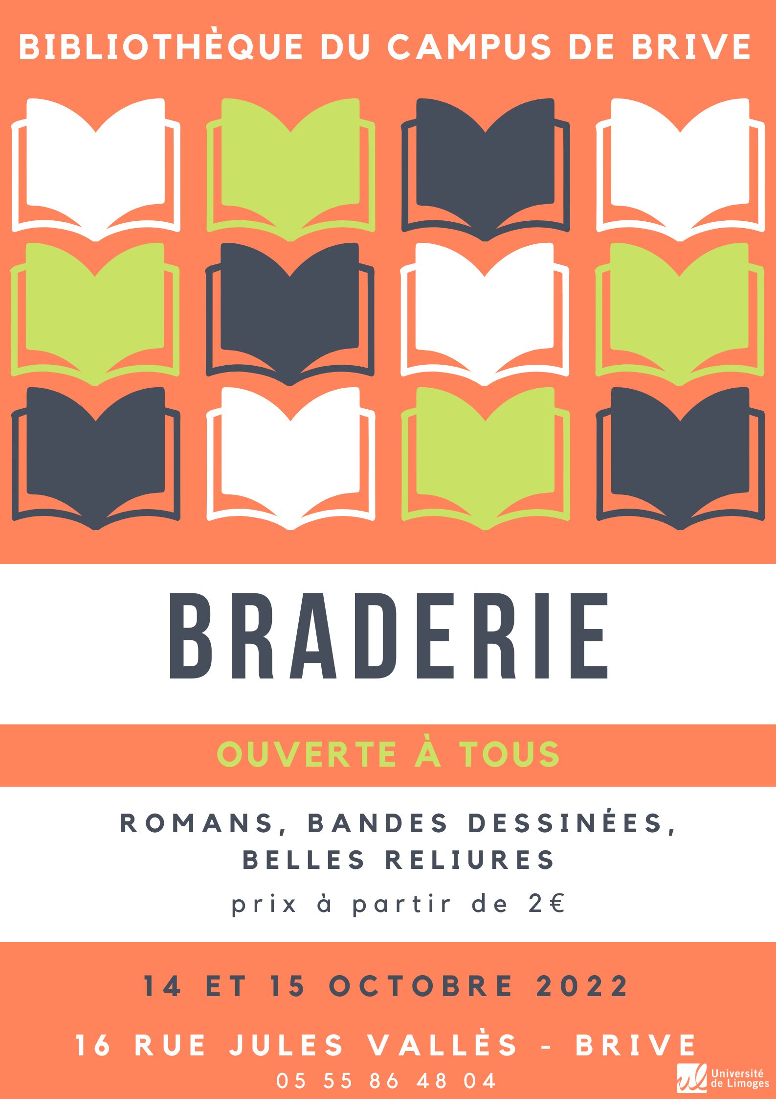 La Bibliothèque du Campus de Brive organise sa seconde braderie les 14 et 15 octobre prochain. Les livres proposés à la vente sont issus des collections de culture et loisirs (romans, bandes-dessinées, documentaires pout tous les âges) mais également des revues juridiques anciennes reliées en cuir ou tissus.