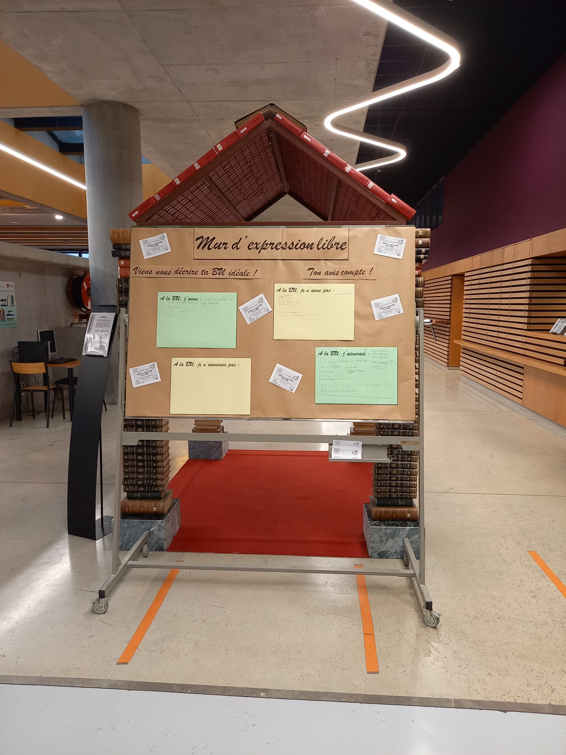Dans ce cadre, nous avons mis en place un Mur d’expression libre au sein des locaux de la bibliothèque, chacun pourra ainsi s’exprimer sur ce qu’il aime ou pas à la BU, ce qu’il aimerait ou pas à la bibliothèque. Là-encore, l’idée est de recueillir vos besoins, vos attentes, vos pratiques, vos réticences, etc…