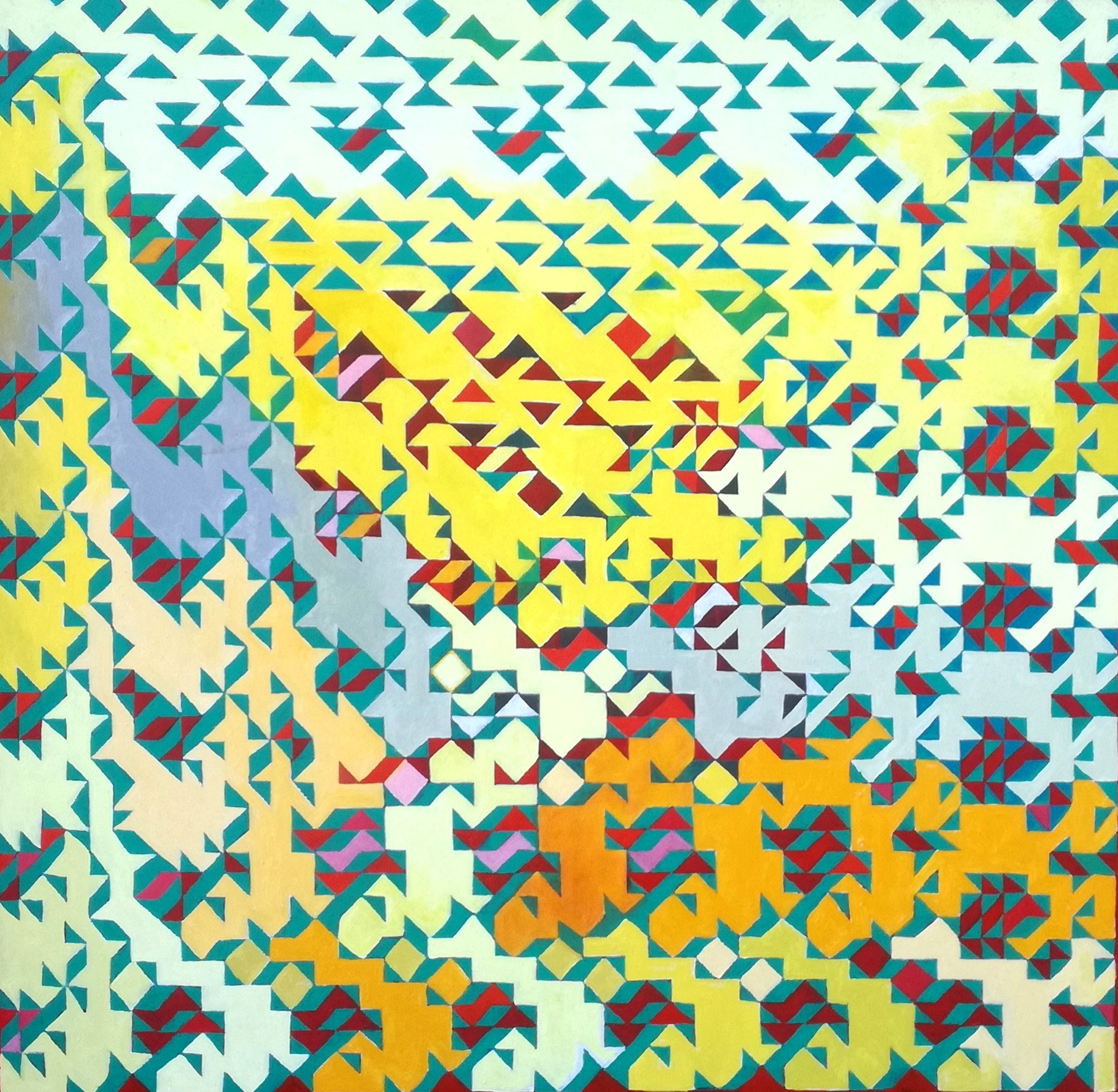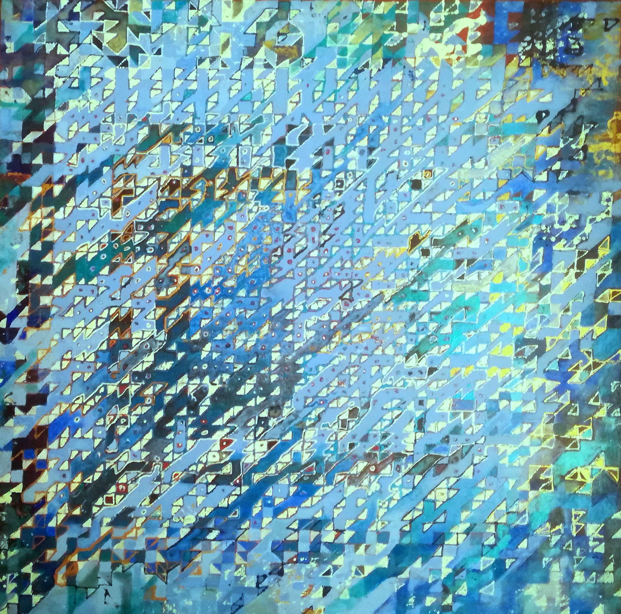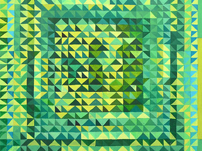 Vous y découvrirez une série de tableaux du peintre Reg Alcorn, construits à partir de séquences de motifs géométriques très simples, souvent enroulées en spirale à l’identique à partir du centre de chaque tableau. De ce principe très simple naissent des motifs extrêmement riches, complexes et variés, que l’artiste traite ensuite avec son art consommé de la peinture et de la couleur.
