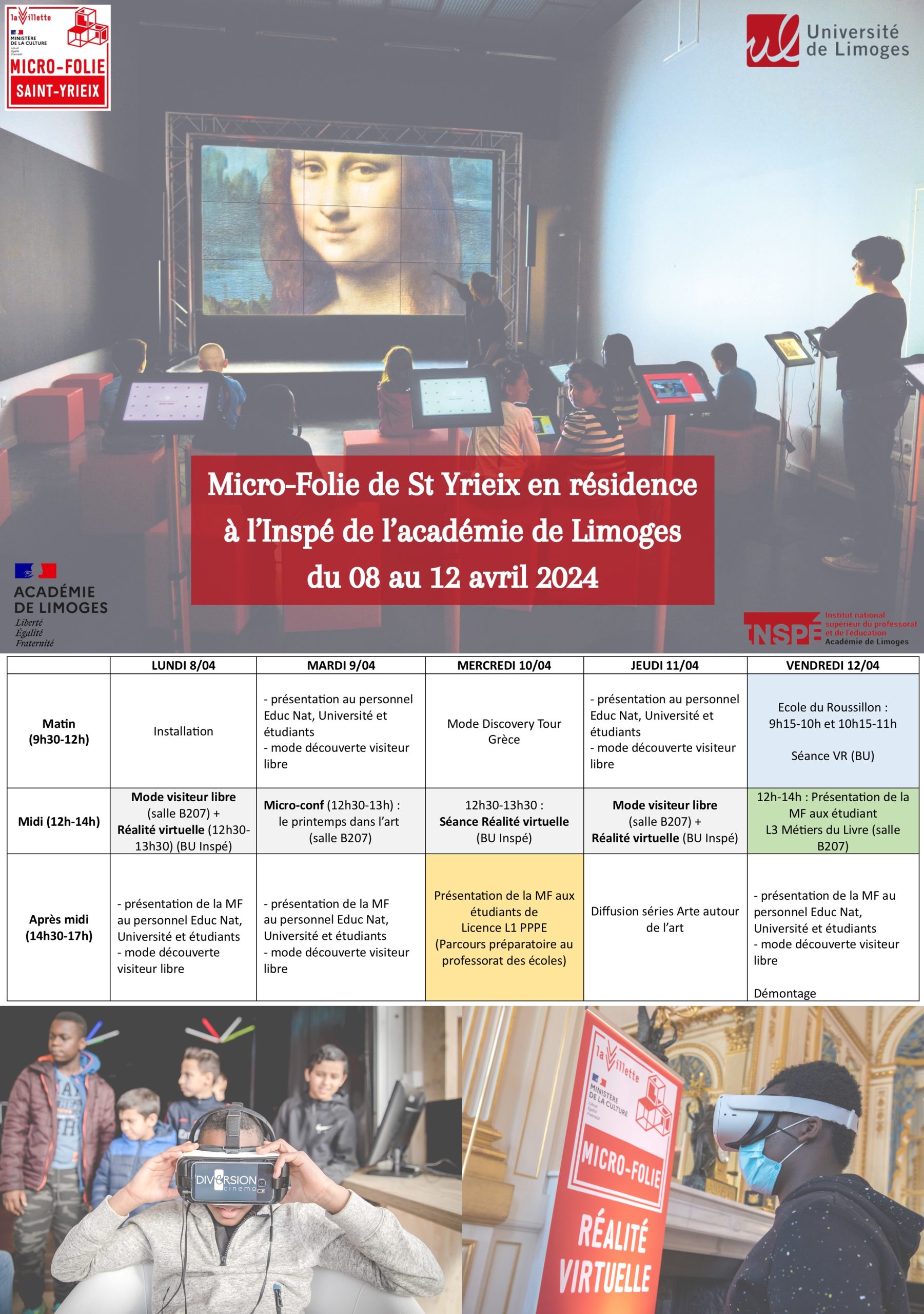 - Le programme de cette Micro-Folie est disponible sur le site internet de l’Inspé à l’adresse suivante : https://www.inspe.unilim.fr/2024/04/03/%f0%9f%96%bc%ef%b8%8f-micro-folie-a-linspe-de-limoges/
