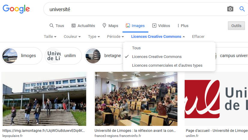 Pour trouver des images libres de droits, vous pouvez chercher dans une des nombreuses banques d’images sous licence libre présentes en ligne, ou bien utiliser la recherche avancée de Google Image en précisant « Licences Creative Commons » dans les outils supplémentaires de recherche proposés.