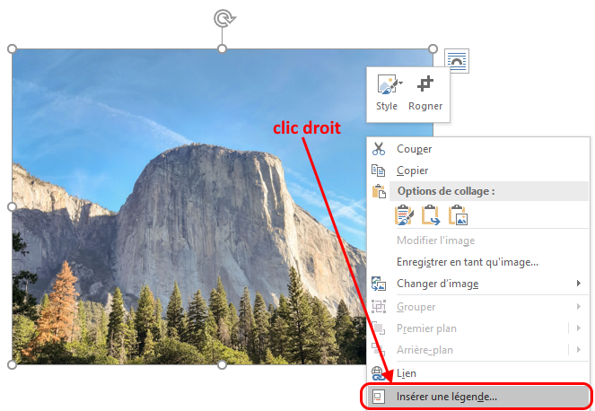 Faites un clic droit sur l’image, le graphique, etc, et cliquez sur Insérer une légende :