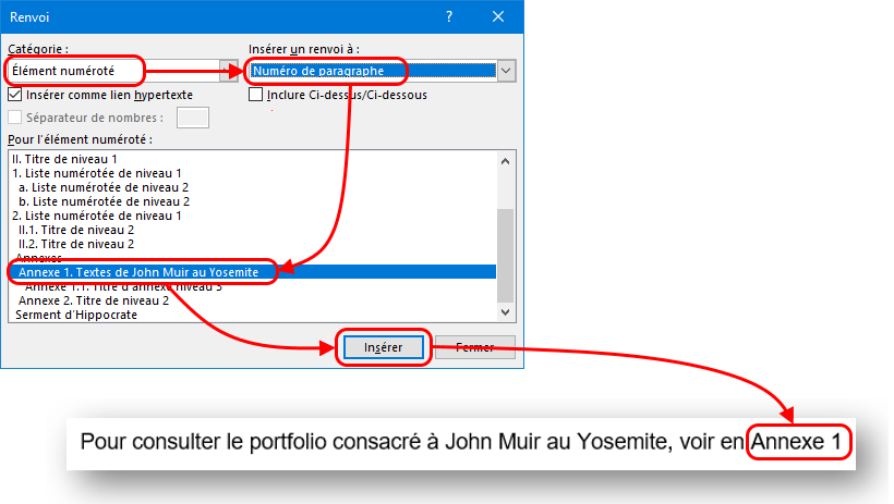 Pour un renvoi vers un titre de votre document (par exemple Partie 1 ou Annexe 2), choisissez Élément numéroté dans le premier menu déroulant, puis Numéro de paragraphe si vous voulez insérer l’expression « Annexe 1 », et sélectionnez le titre souhaité dans la liste :