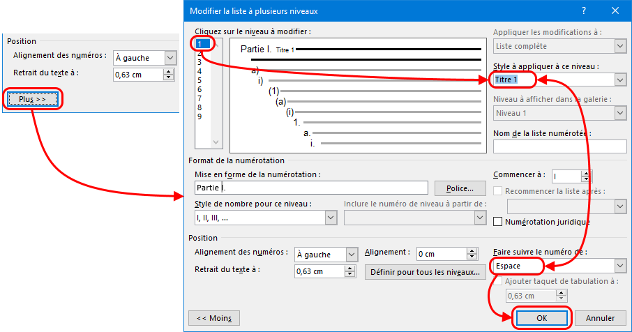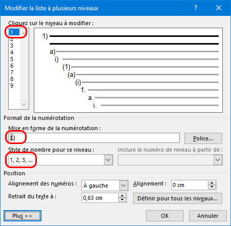 C’est ici que vous allez pouvoir définir, niveau par niveau, comment doit se comporter la numérotation.