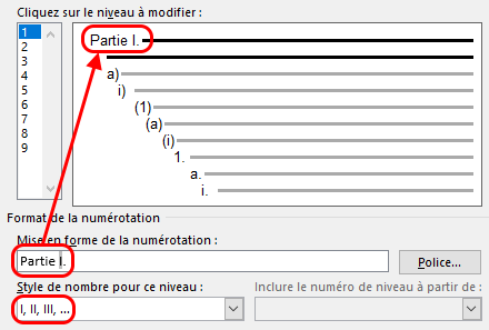 6. Pour personnaliser le niveau 1, saisissez le mot « Partie » avant le numéro dans la boîte de mise en forme, puis choisissez les chiffres romains dans le menu Style de nombre et remplacez la parenthèse par un point.