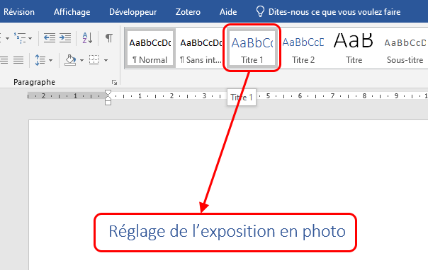 1. Insérez un premier titre dans votre document et appliquez-lui le style Titre 1 (cliquez sur Titre 1 dans la barre des styles).